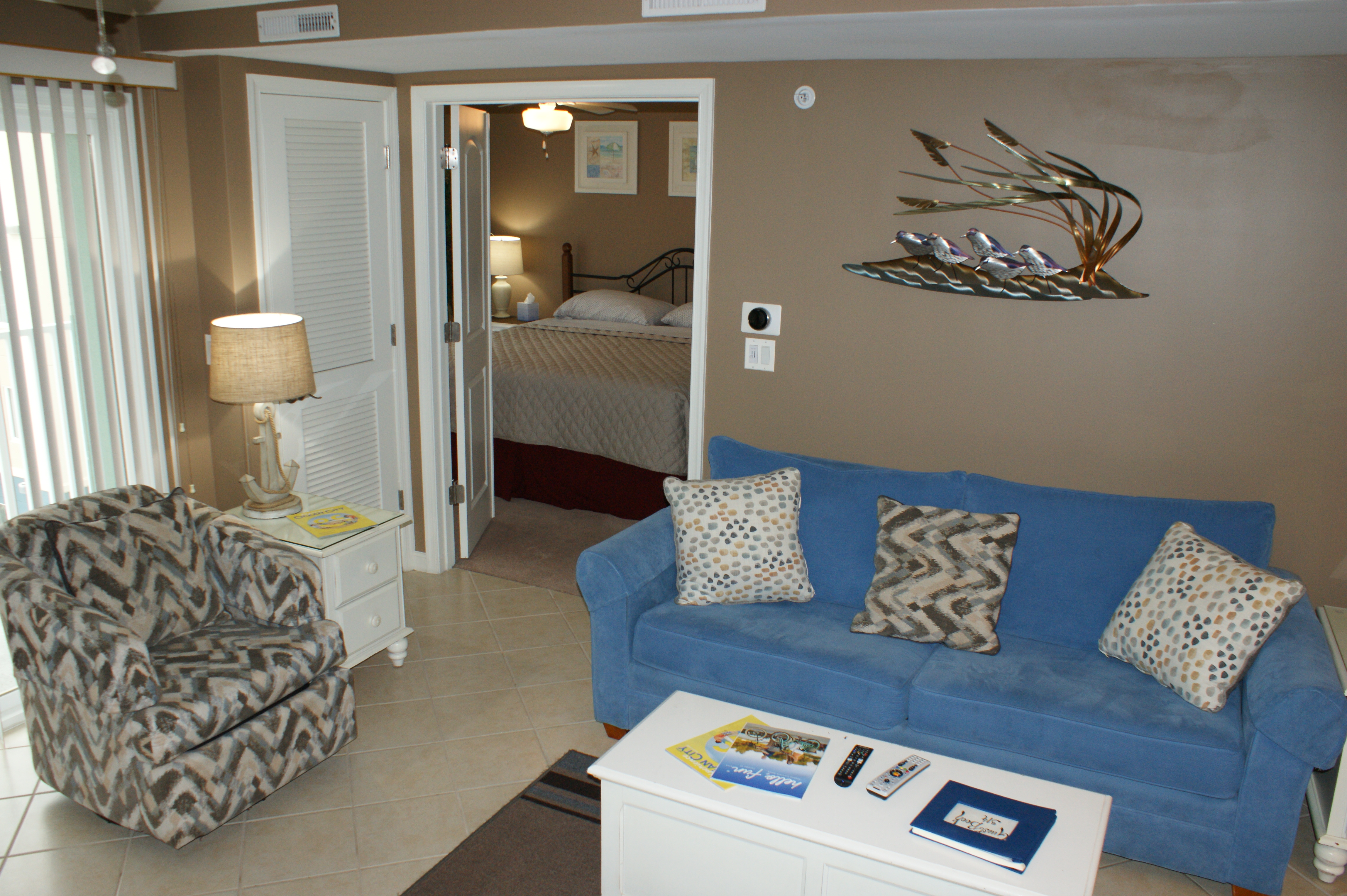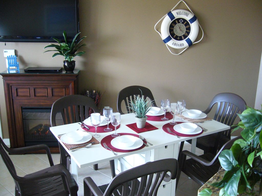 The condo is warm and cozy with a great view of the bay. It's also centrally located. We found the condo clean and nicely decorated. The owners are very attentive and welcomes feedback to help improve future stays in their condo. The balcony overlooks the bay and the adjacent Hotel pool which is decorated with a fire pit, tiki torches and the pool is illuminated with blue lights in the evening, making it a nice and pleasant place to sit and relax.